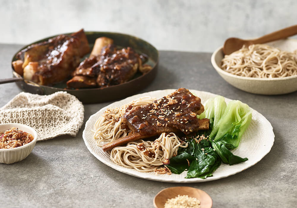 Slow cooked Wanderer beef short ribs with soba noodles & Asian greens